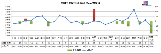建筑鋼材:9月4日,全國25個主要城市20mm三級螺紋鋼均價3864元/噸,較上個交易日下跌3元/噸。昨日夜盤期螺明顯跳水,市場心態(tài)趨于謹慎,上午國內(nèi)建筑鋼材價格以穩(wěn)為主。市場高價資源成交有所放緩,目前絕大多數(shù)地區(qū)螺紋現(xiàn)貨資源較為充足,庫存同比仍處于相對高位。預計短期國內(nèi)建筑鋼材價格或高位盤整運行。