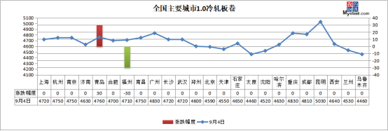 冷軋板卷:9月4日,全國24個主要城市1.0mm冷卷均價4681元/噸,較上個交易日持平?;久婵矗滠埾掠涡枨笊仙抢瓌幼罱鼉r格上漲的最強因素,下游制造業(yè)訂單增加,原材料消化明顯增加,帶動鋼廠直發(fā)終端訂單轉(zhuǎn)好,市場投放相應減少,對價格有一定的支撐。綜合來看,下周國內(nèi)冷軋價格震蕩上行為主。